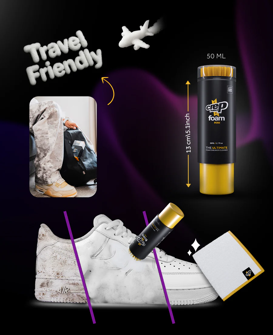 The Crep Protect Foam Mini is a compact 50ml all-in-one cleaning kit with a built-in brush and microfiber cloth. Unlike traditional sneaker cleaners designed for home use, this is made for cleaning on the go. Fix dirty sneakers instantly — even while traveling or out in public.